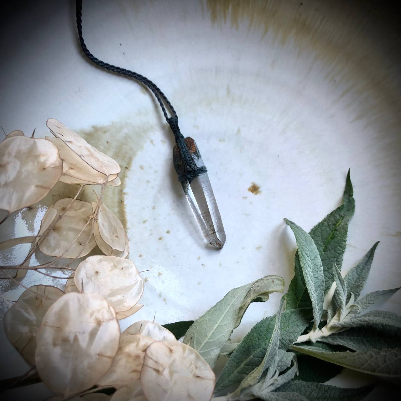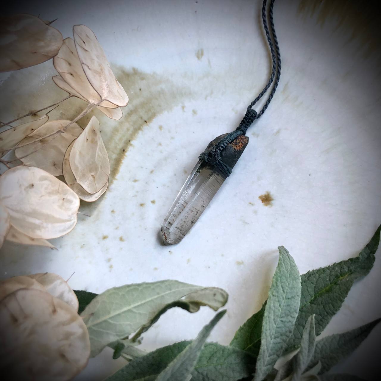 Deze prachtige Lemurian kristal zou je bijna een toverstokje mogen noemen. De energie is krachtig, direct en zuiver. Een heel bijzondere Bergkristal die met de hand gedolven is en zonder een enkele behandeling tot sieraad gemaakt is. Geen chemisch badje zoals vaak bij Bergkristal wel het geval is, de glans en helderheid zijn 100% natuurlijk. Wat ook zo bijzonder is, is dat het kristal aan twee kanten gekristalliseerd is. Dat wil zeggen dat hij aan beide kanten een punt heeft gevormd en dus nergens heeft 'vastgezeten' maar als een 'zwemmer' is kunnen vormen in de vloeistof diep onder het aardoppervlak. Ook heeft dit kristal een laagje Chloriet, alsof moeder natuur even een vleugje groene glitters uitstrooide over het kristal. Een bijzonder stukje kunst!