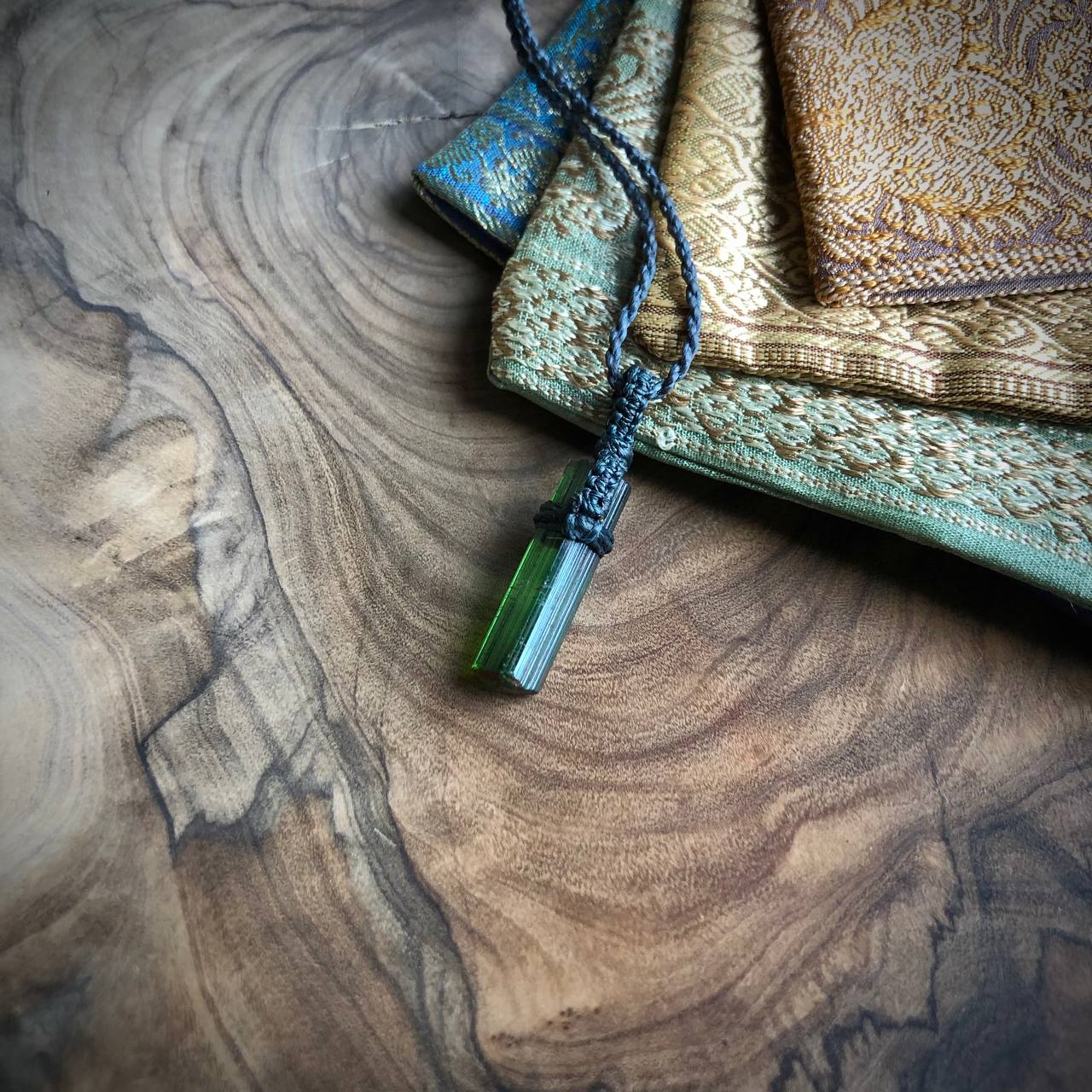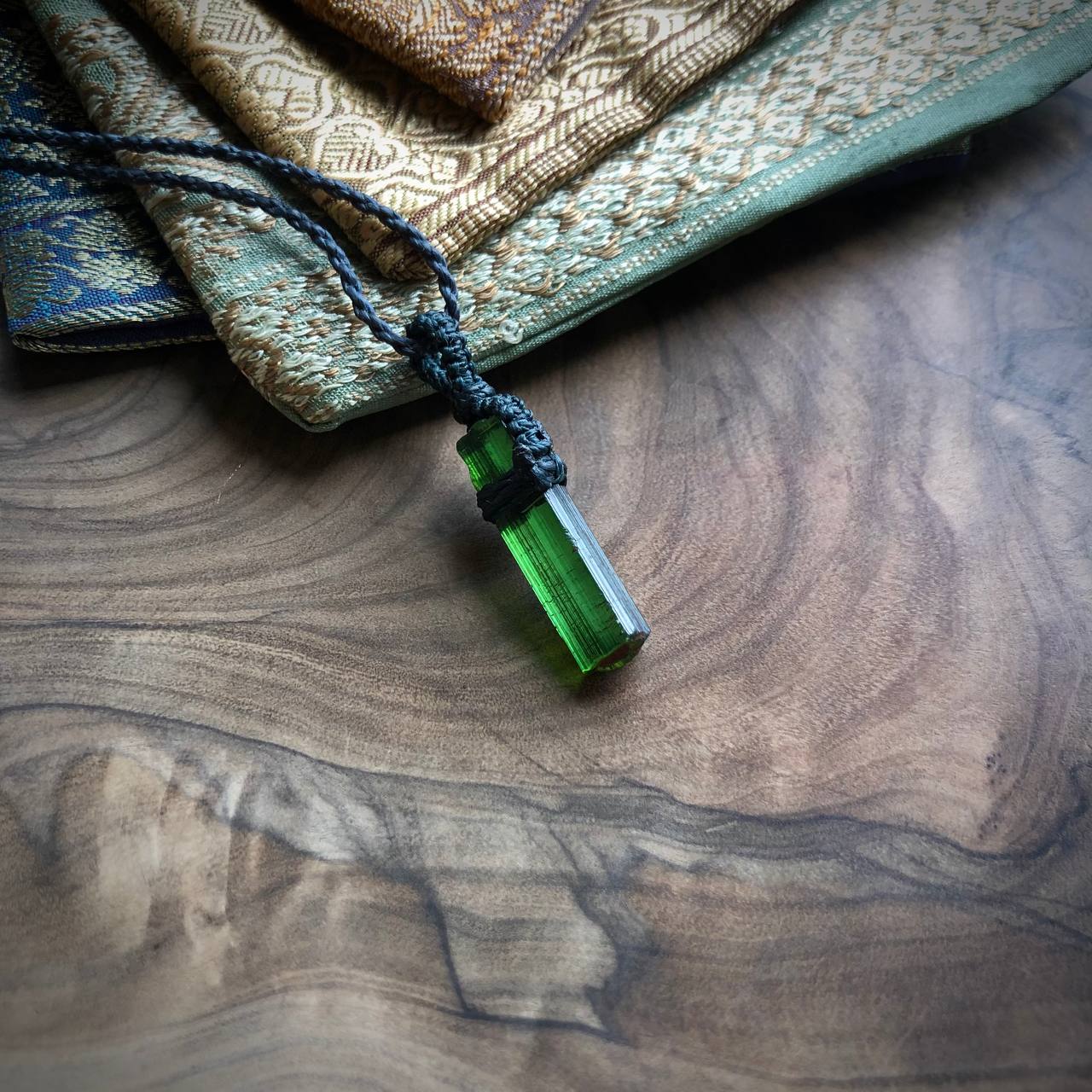 Als een toverstokje uit een sprookjesbos... Een waar magisch stukje natuur, gemaakt tot draagbaar sieraad om dag in dag uit bij je te dragen. De kleuren van deze groene Toermalijn (Verdiliet) zijn uitzonderlijk mooi en de glans doet bijna watertanden.